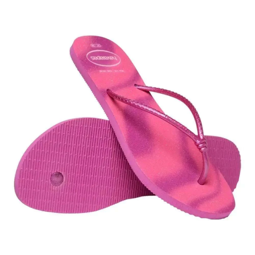 HAVAIANAS Símbolo do alto-astral brasileiro em qualquer parte do mundo, a sandália Havaianas virou assunto nas páginas das grandes revistas e jornais do mundo e conquistaram algumas das vitrines mais concorridas do planeta. Hoje a marca está presente em mais de 150 mil pontos de venda em todo o Brasil, exporta para mais de 80 países e oferece produtos que vão muito além das clássicas sandálias. O Chinelo Havaianas Feminino Slim Tube Gloss Rosa. É uma escolha sofisticada e cheia de estilo. Sua tira fina em formato de tubinho proporciona um visual delicado e atual, enquanto a palmilha revestida com glitter gloss adiciona um brilho sutil e glamouroso. A cor vibrante Rosa Gum é perfeita para o verão, destacando seu visual com energia. Além disso, o conforto excepcional e a durabilidade resistente ao uso diário tornam o Slim Gloss um must-have para os dias ensolarados.