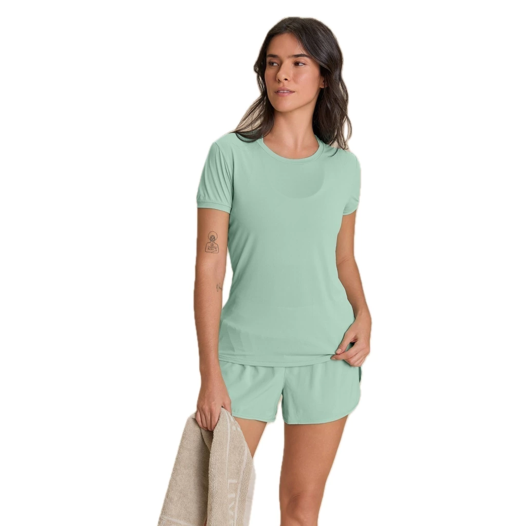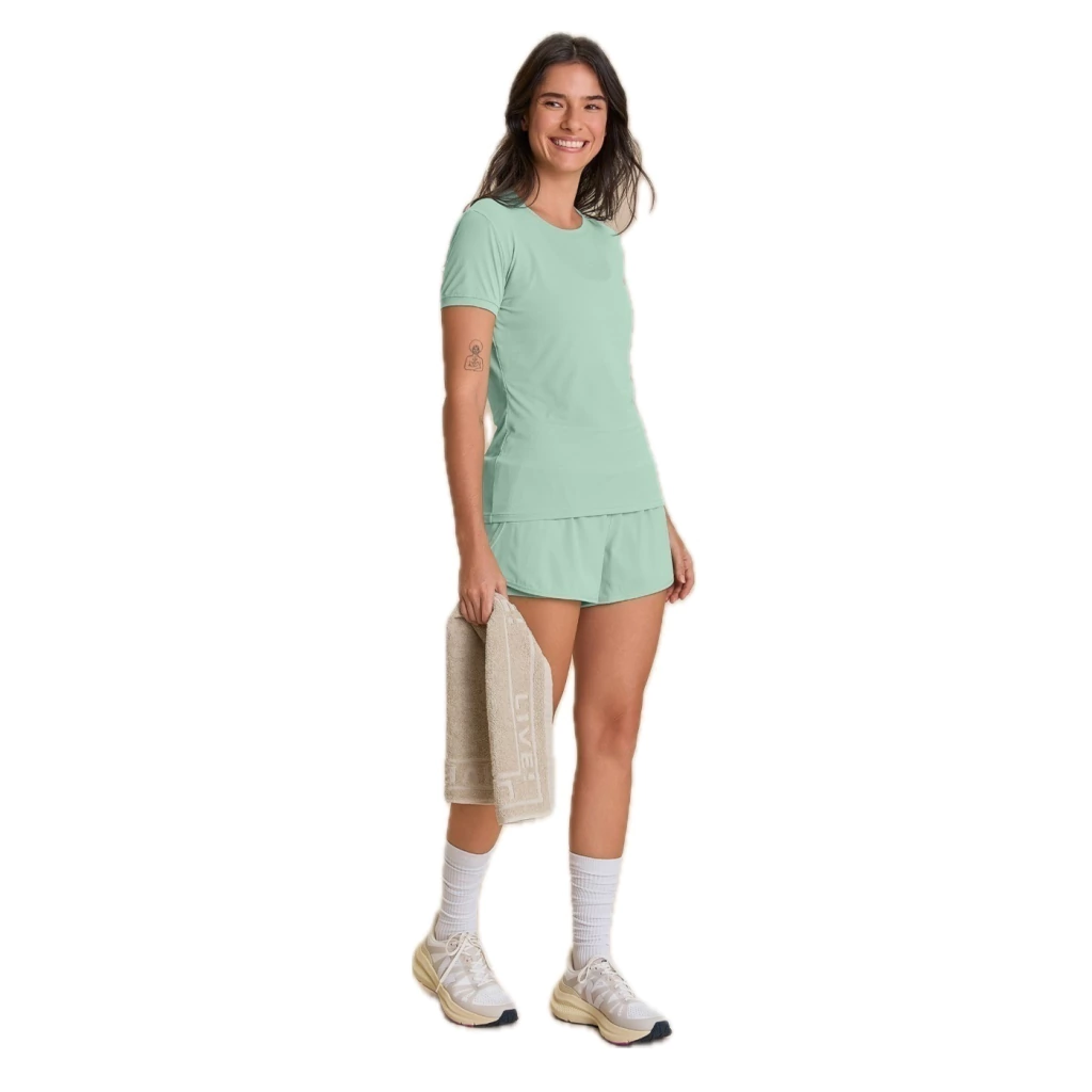 Tecido plano de caimento leve, com boa elasticidade, superfície lisa e toque suave, proporciona conforto e liberdade de movimento durante as práticas esportivas. Conta com tecnologia Quick Dry, que acelera a evaporação da umidade e ajuda a manter o corpo seco, e Easy Care, que facilita os cuidados diários ao reduzir a necessidade de passar.